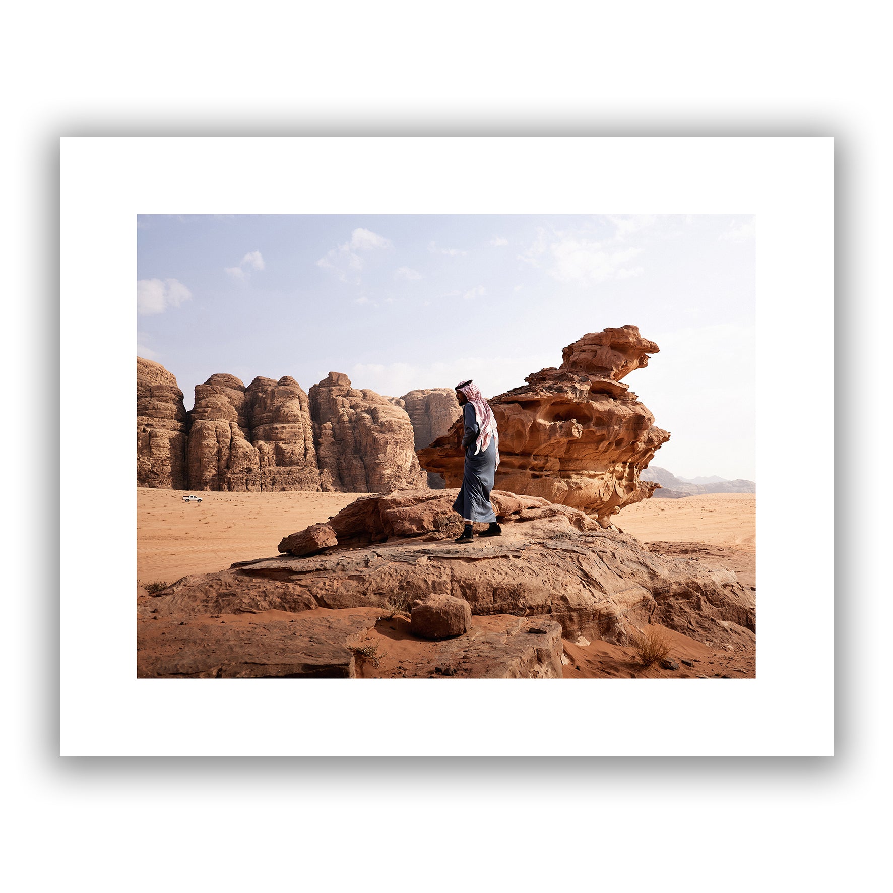 Transform your space with our captivating fine art print, showcasing a desert nomad in a breathtaking landscape where rich orange-brown hues beautifully contrast with the serene blue sky. Printed on luxurious Hahnemühle Torchon paper, this piece is available with an optional high-quality solid wood frame and float glass, offering gallery-worthy standards for your home. Immerse yourself in the allure of the desert and let this stunning artwork draw your gaze again and again!