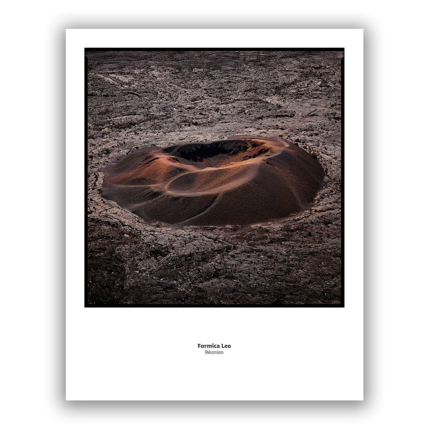 Experience the awe-inspiring beauty of Formica Leo. This print showcases a dynamic vulcanic landscape and desolation, featuring the iconic Vulcano Piton de la Fournais. Vivid orange highlights add a striking contrast to the unique landmark. Printed on our renowned Hahnemühle Torchon Paper, this piece is a must-have for any art collector.